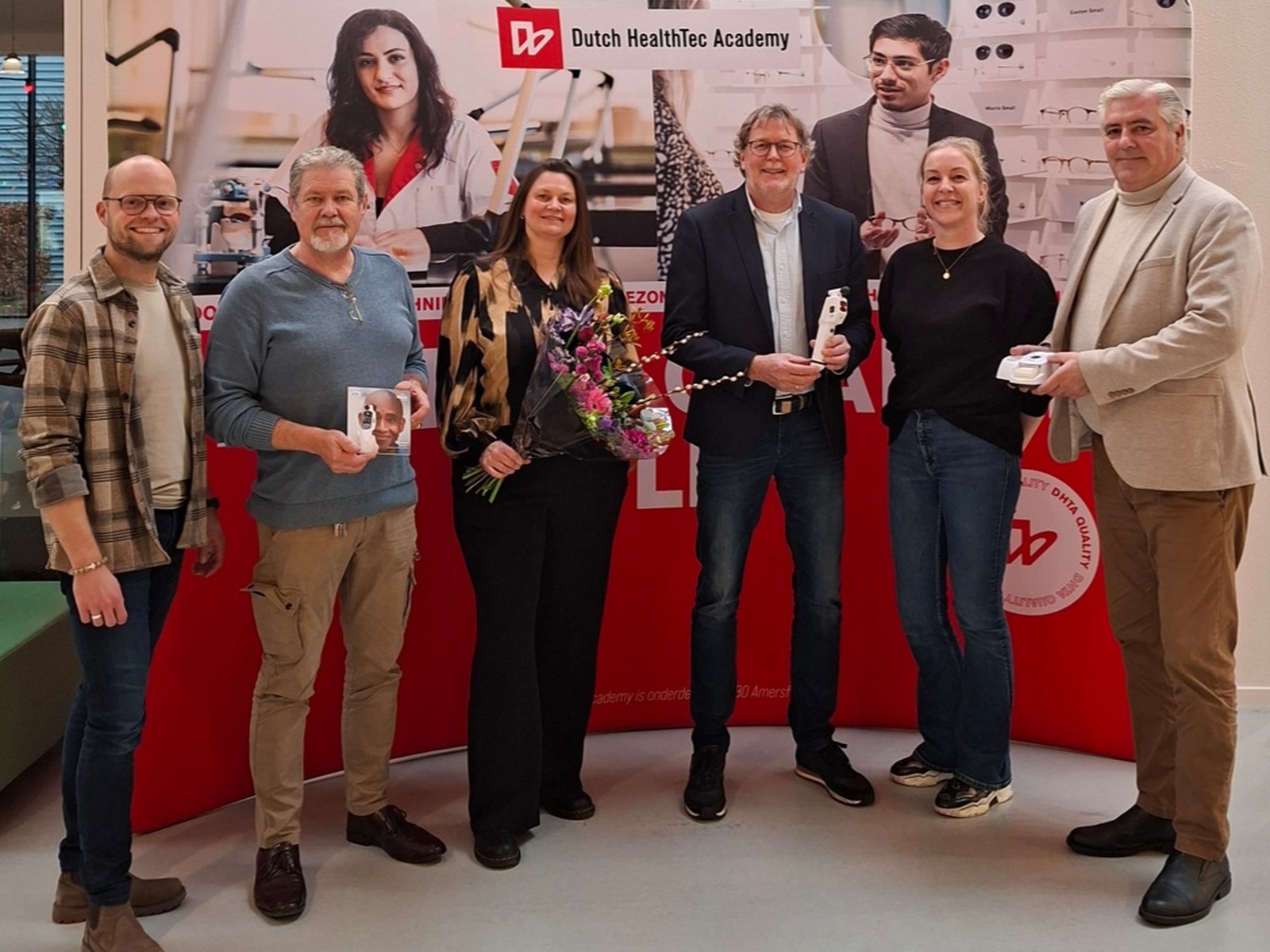Compact, geavanceerd en verrassend gebruiksvriendelijk: dat is de Tono-Vera tonometer van Reichert in een notendop. Dit innovatieve instrument is speciaal ontwikkeld voor het nauwkeurig meten van de intraoculaire druk (IOP) en vormt een waardevolle aanvulling op iedere optiekpraktijk. Op 9 december werd de Tono-Vera officieel overhandigd aan de Dutch HealthTec Academy (DHTA) in Utrecht. Tijdens een feestelijk moment op de school waren vertegenwoordigers van fabrikant Reichert, distributeur Optiekvision en de opleiding zelf aanwezig. Een samenwerking met oog op de toekomst, waarbij studenten leren werken met moderne apparatuur die aansluit bij de dagelijkse praktijk.
